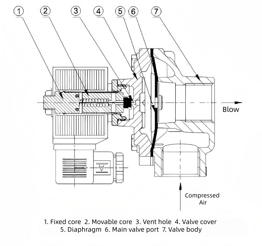 شیر پالس الکترومغناطیسی با زاویه راست DMF-Z-20 دیافراگم شیر پالس الکترومغناطیسی را به محفظه هوای جلو و عقب تقسیم می کند. هنگامی که هوای فشرده تامین می شود، از طریق دریچه گاز وارد محفظه عقب می شود. در این مرحله، فشار محفظه عقب مجموعه دیافراگم را مجبور می کند تا خروجی شیر را ببندد و شیر پالس الکترومغناطیسی را در حالت "بسته" قرار دهد.